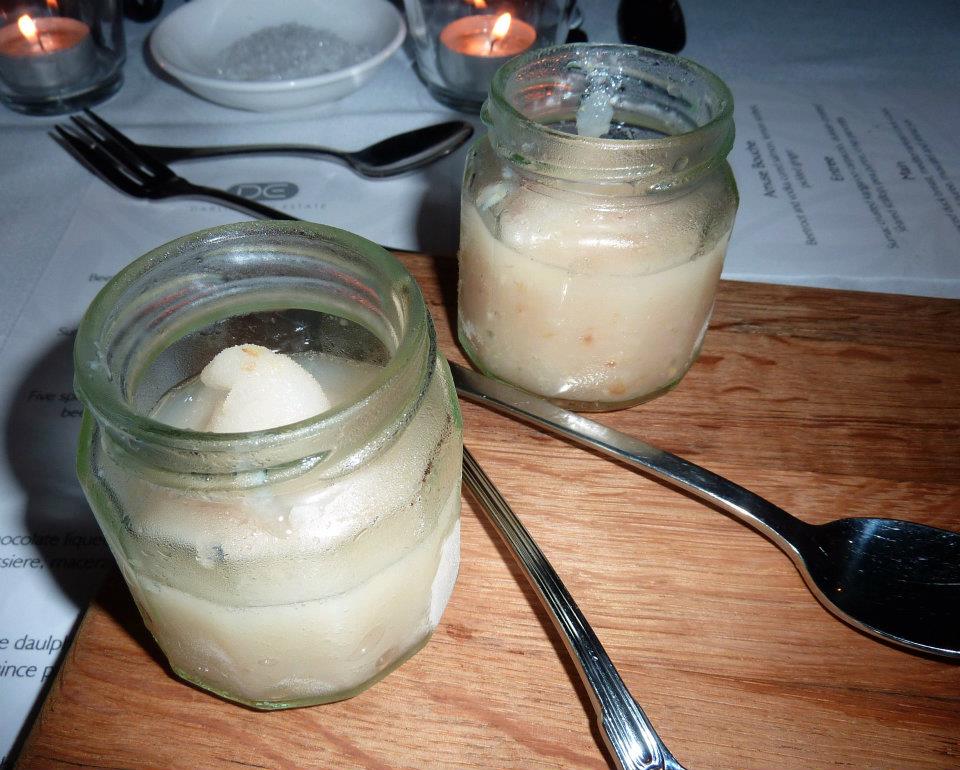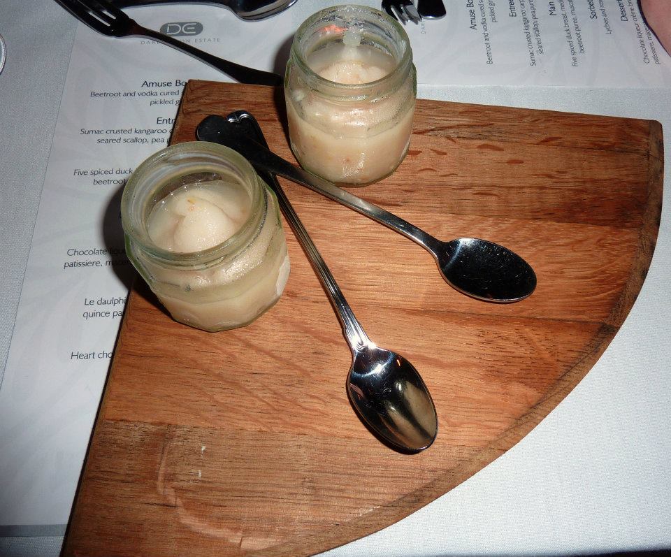 Before we turned our attention to the sweeter side of thing, always best to cleanse the palate. We were presented with dainty glass jars full of the most delightful lychee and rosewater sorbet. What can I say – those two flavours should be each other’s valentines because they go so well together! And I thought the presentation was precious – jars are cool!