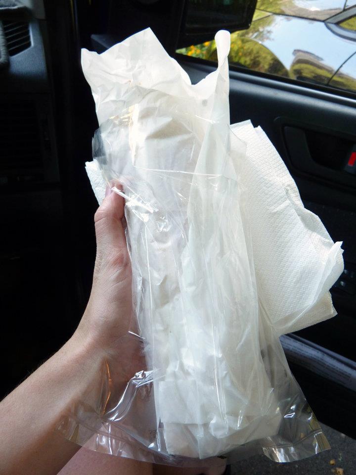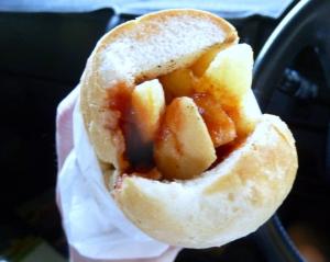 I walked back to my car with the precious cargo in hand and sat there with the air conditioner cranked and took my first bite. It had totally been worth braving the heat for this. The crispy bun with the ample serving of chips…….. magic! And with the added joy of the tomato sauce and salt – what a joy!