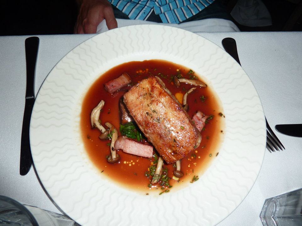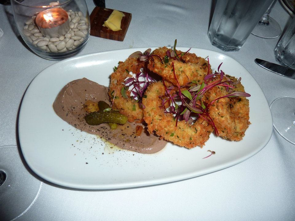 Now we’d been told that ordinarily the onion ring and parfait starter only came with two onion rings…… which I thought made it seem like an expensive $18 entree – 2 onion rings? So we asked if they could make it four, which they kindly obliged….. though I suspect they would have just charged us for two serves, but hey that’s fine. And when they arrived….they were big onion rings and I’m a big onion ring fan, however there’s something unglamorous to me about parfait smeared on a plate…. Even with the cornichons on top and the decorative microherbs. I did try the parfait and it was fine, its just really not my cup of tea.