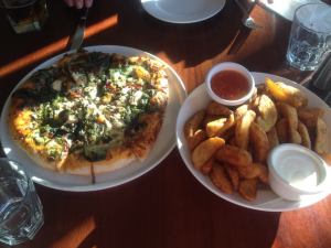 I don’t mind the layout, it’s nice and open with plenty of comfy chairs and lounges throughout and as the weather had cooled down they had the windows open in the restaurant area, so it was all very lovely and breezy. We sat ourselves at one of the tables near the windows and decided that our long overdue catch up sesh would be further enhanced with a bowl of wedges (with sour cream and sweet chili of course) and also one of the Roasted Veggie Pizza (Mediterranean vegetables, spinach and fetta on a homemade tomato sauce base, with mozzarella cheese and fine herbs) to share. It was going to have us sorted for dinner also, which was another bonus.