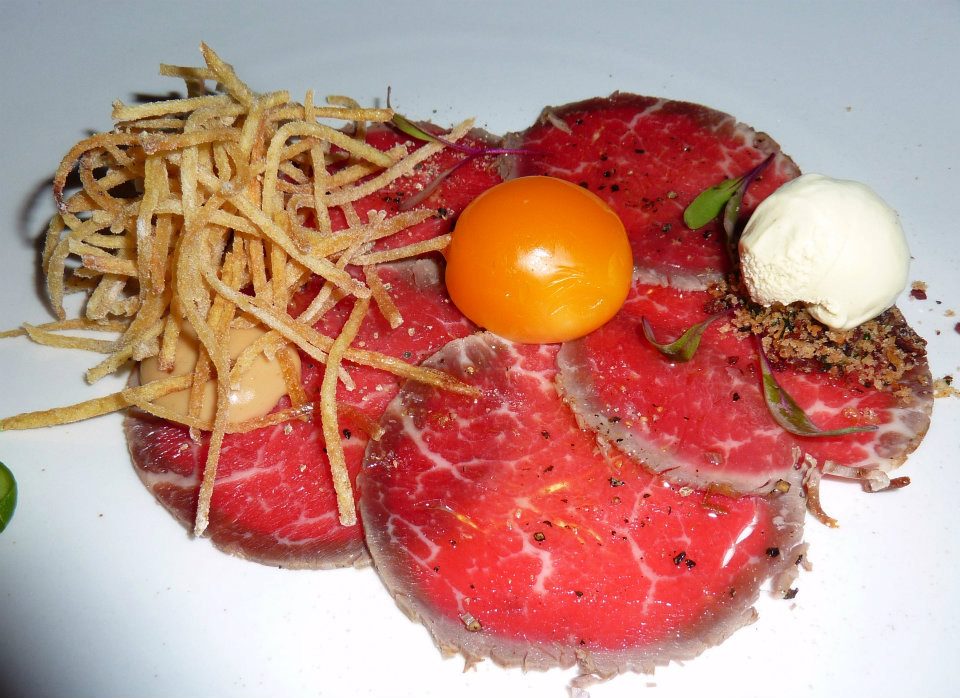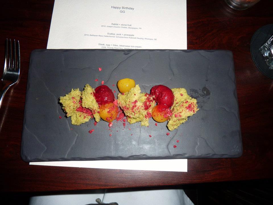 Now back last year, GG and I had been lucky enough to first sample some of Scott Sullivan’s work at the Largesse Dinner when he made this amazing sort of take on bacon and eggs (http://atomic-temporary-19383105.wpcomstaging.com/2011/10/08/largesse-dinner-5/). It was such a creative and delicious course and having seen what he had done with egg once before my curiousity was definitely piqued by the next course on our degustation menu – Steak, eggs and frites, bearnaise ice cream (2009 Picardy Pinot Noir). It was presented to us and we both smiled – another gem! Thinly sliced carpaccio beef, with a perfectly rounded egg yolk, a side serve of crunchy potato frites and the piece de la resistance was the bearnaise ice cream. Texturally it was just a wonder and the flavours did not disappoint. There’s something wonderful about egg yolk. Whether you are dunking toast soldiers into it or in this case utilising it for a more creative endevour to cap off a beautiful plate. Another winner! That was three from three!