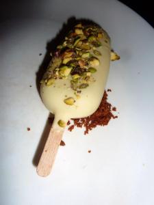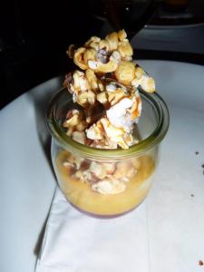 And then dessert arrived and it was a vision and another special treat for GG with a special banner on his plate with more birthday wishes. He was very spoilt! On the menu for dessert was Jelly and Ice cream (2007 Chapoutier Muscat de Beaumes de Venise). I love how such simple descriptions are given but you just know that what you actually recieve is going to be much more than just “jelly and ice cream”. The dainty jar of jelly – topped with the crunchy caramel popcorn was such a fantastic contrast of texture and once we’d made our way through that we still had the little ice cream to enjoy too. And it was such an indulgent item with its thick white chocolate coating and its dusting of crumbed pistachios. It was a perfect end to a sensational degustation menu.