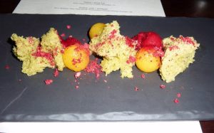 We were both feeling fairly comfortable at this point and knowing we had predessert and then dessert to get through we were confident we could do it. The size of the predessert definitely surprised to the bigger side though! We had been more expecting some sort of sweet spoonful but this was quite an indulgent size! But hey I’m a dessert fan from way back so I was in no way disappointed! How could you be with this fabulous combination of pistachio, pear and cherry. There was the fluffy cake and the contrasting sorbets with the sweetness of pear and a litle tartness from the cherry – all of it just bursting with flavour. Loved it! Bring on dessert 🙂