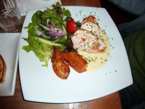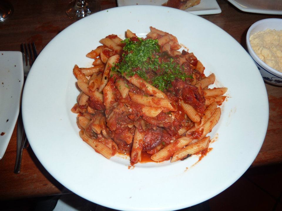 So then onto mains….. I went with the Penne al Diavolo ($13.50) which was Penne, spicy Italian sausage, onions, mushrooms, in a chilli tomato sauce. Whenever I go to order pasta there’s always that internal debate between something creamy versus something more tomato. I tend to find creamy pastas just a bit too much, whereas I thought I would have more luck putting a respectable dent in something of the tomato persuasion. Across the table, GG decided to colour outside the lines and ordered Pollo Siena’s ($27.90) which is Chicken breast filled with prawns, spinach and capsicum in a light cream sauce served with roast potatoes and salad.