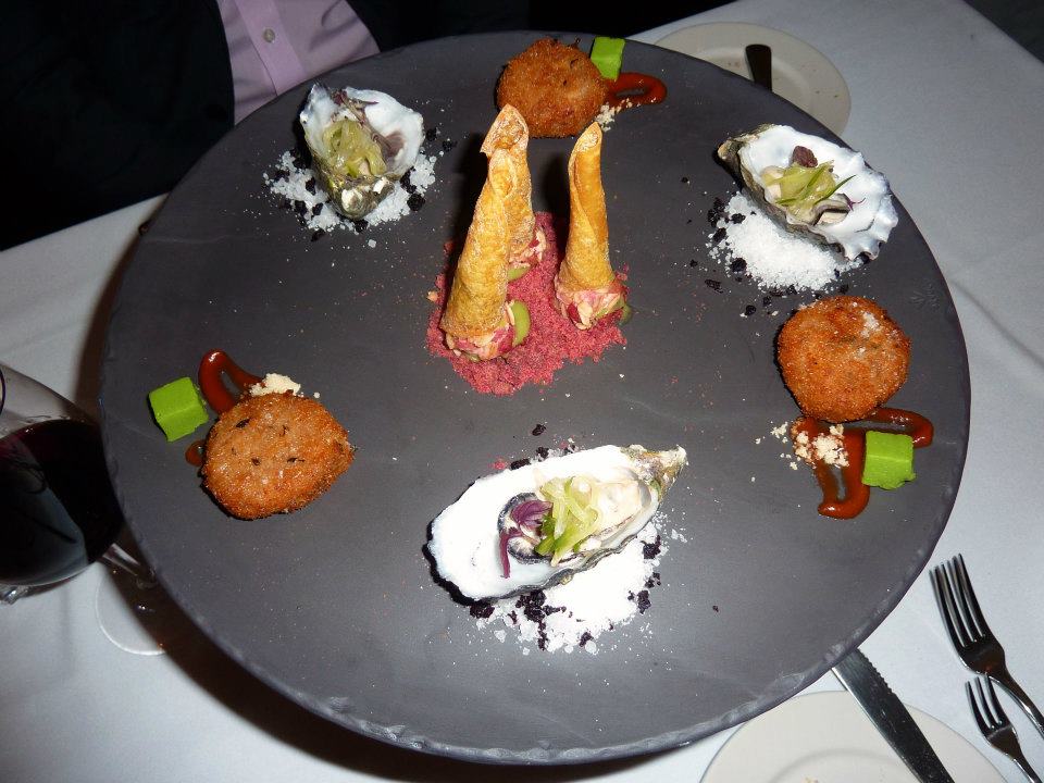 As well as this we ordered the Balthazar Tasting plate (per person – $18.00). It came with three choice items for the three of us to sample. I decided I’d start with the oyster, mainly because I’ve never been a fan and I thought I’d get it out of the way early. Oh my goodness. This is the first (and putting it out there – only) oyster I’ve ever enjoyed. It was served poached, with a fragrant limey dressing and it was amazing. From there we tried the delicate little cones, full of a celery flavoured mousse, with a goat’s cheese and dusted with dried beetroot. Visually very pretty, however celery in mousse form doesn’t really have much zap in terms of flavour. It was fine though. And finally there was like a little croquette, which came with a sauce which had been described to us as hot. We debated the level of heat in the sauce as being on the mild side, but nonetheless this was a tasty morsel. As tasting plates go, I thought this had been a good one. Presentation had been excellent and I liked their careful attention to detail.