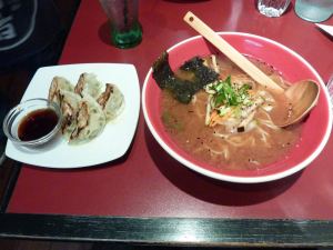 Now I’m fairly sure that I was supposed to put the gyoza in my soup, but as it turned out they were just so tasty by themselves that I ended up working my way through those on their own. Plenty of flavour and a nice crispy edge on them, definitely some of the nicest I”d had. And the ramen itself was also really delicious. I tried to put a respectable dent in the noodles, but they just seemed to never reduce in volume, despite my best efforts. I don’t think I’ve ever finished a serve of ramen now that I think about it. But I did my best and I loved what I got through.