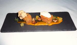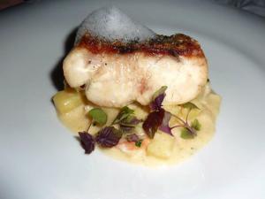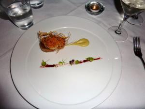 Next up was where two worlds collided and we both ordered the Seared Scallop, Pig’s Head, Apple ($17). This, we were told, was Chef Todd Stuart’s signature dish. GG had ducked to the bathroom at this point so I took the opportunity to find out a little more about how this dish was made. Apparently boxes of full pig heads arrived, which did strike me as a little macabre, but hey such is life in a kitchen I suppose 🙂 And these are then cooked for a good 12 hours and then little circles of meat are taken from the head. I suppose a lot of it would come from the cheek. They seem like a good meaty spot. So anyways, these meat parcels are coated in a bread crumbs and fried, then teamed with a scallop and a little apple sauce and voila, the plate is ready. The combination of the pork with the scallop was just a match made in heaven. The sweetness of both meats, further enhanced by the apple…. Ahhh happy sighs all round. This was a total winner!