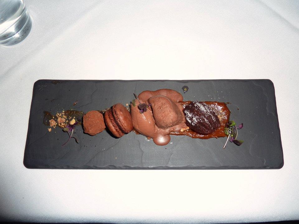 When desserts arrived I knew that if this was actually going to kill me that it would be a wonderful way to go. Arranged on my plate was a chocolate macaron, a bitter chocolate truffle, chocolate delice, this frozen chocolate aero mousse and a chocolate madeline. As a chocolate fan from way back, this dessert was essentially perfection to me.