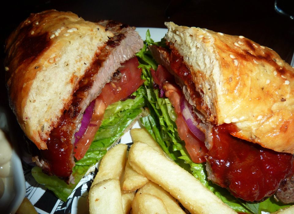 Across the table I really enjoyed my choice of the Steak Sangar – Arguably Chef Django’s greatest culinary achievement, a medium grilled slab of prime rump, garden fresh salad, onion and relish, aioli all on his famous homemade Turkish bread and served with golden chips ($14.50). Talk about a hell of a description! The freshly baked turkish bread was tasty and full of flavour and a nice effort that they make it. I’ll admit that as soon as I had my first bite I was smitten with this steak sandwich. The relish was this wonderful combination of sweet and spicy. The steak I had just melted in my mouth and what a fabulous contrast this was against the crunchy lettuce. The chips were cooked to an ideal golden crunch and I thought the decision to have a dish with either tomato sauce or aioli on the side was inspired. It was all kinds of yum and just a bargain with the $14.50 price tag. Very reasonable! I was feeling fairly comfortable after my first half, along with more than a few of the chips so I shared the second half of the steak sandwich with GG.