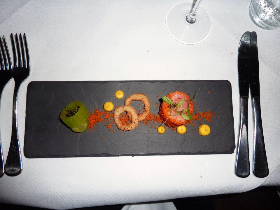 Up next was a dish that looked a little familiar to me. We’ve visited the Red Cabbage crew for GG’s birthday in March and what a fabulous evening that had been! Always looking to test the boundaries with creative flavour combinations, that somehow just always manage to work! Chef Scott had prepared a dish we had actually first sampled on our last visit in March and I was in no way disappointed to get to relive the magic of it! Smoked trout, chilli squid, saffron. It is a wonderful dish, with a well considered balance of flavours – the smokiness from the trout and the refreshing crunch of the cucumber. Just fabulous! I really want one of those cucumber cutters.