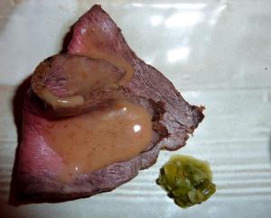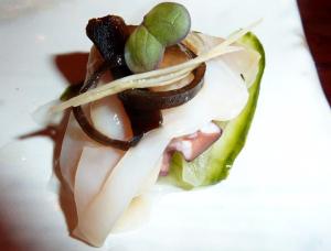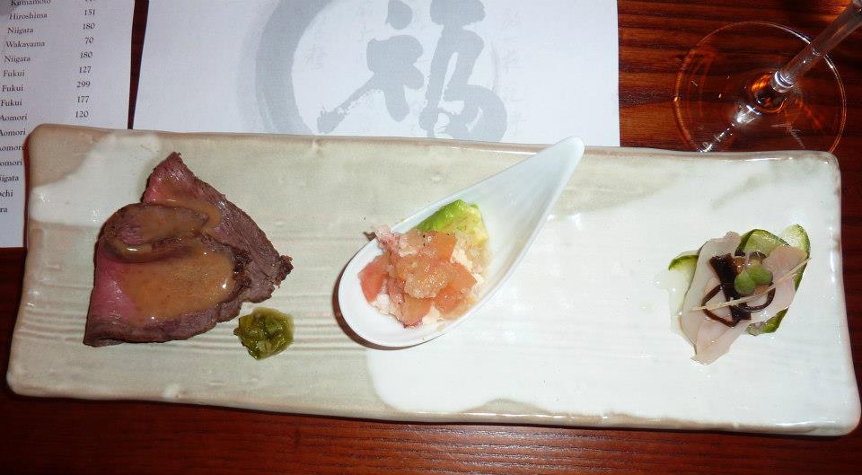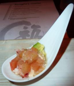 Up next was a selection of Small Morsels – Tsubagi (shell fish) and Octopus (like Sunomono), Beef and Lobster meat and avocado salad. I started with the dainty spoonful of lobster and avocado salad. There was also tomato in the salad and the combination was a wonderfully refreshing mix. Nice way to start on this plate. Now the shell fish didn’t look too scary and actually tasted lovely! Again, it was really fresh, as was the octopus – nothing chewy about it at all! And I left the thinly sliced beef until last and it was delicious. Just melt in your mouth material.