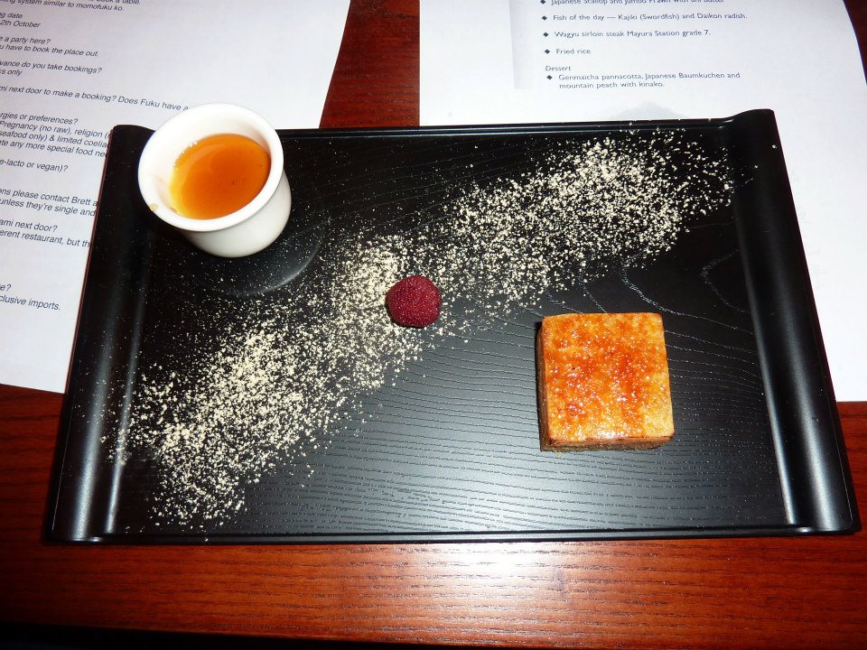 So with the savoury side done, we finished the night with something sweet – Genmaicha pannacotta, Japanese Baumkuchen and mountain peach with kinako.