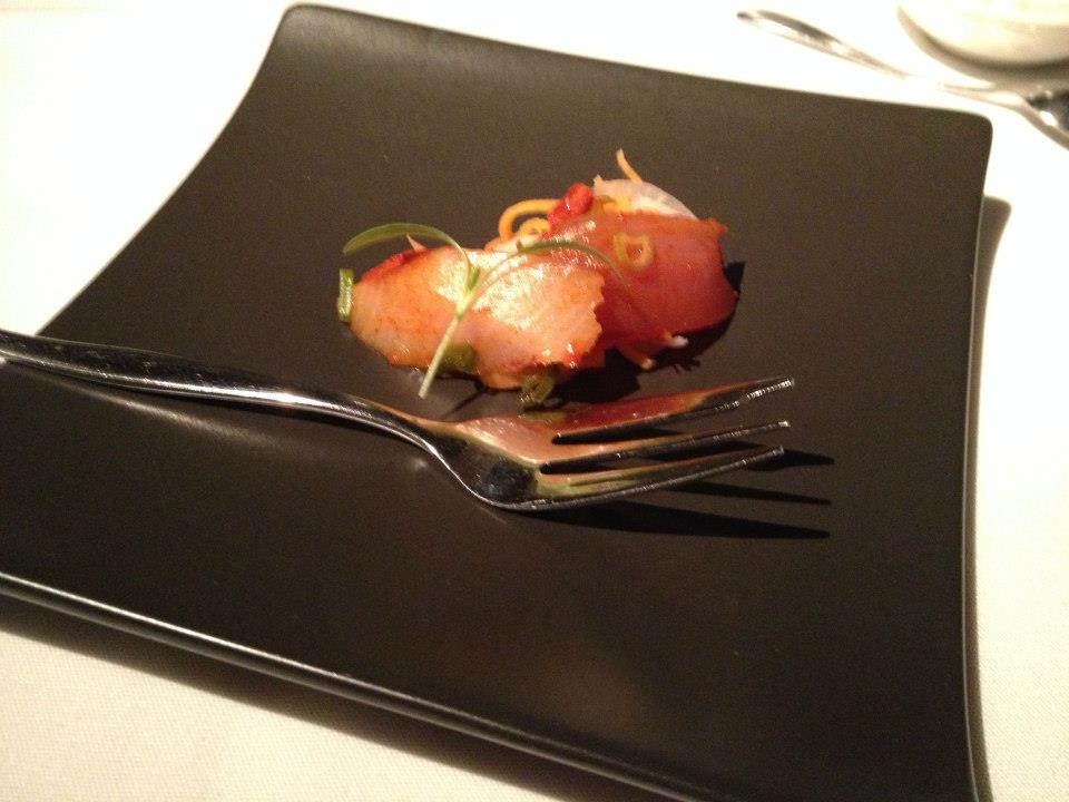 Once we’d finished the oysters and ahead of the first dego course an amuse bouche arrived, Jackons’s take on a greek salad. Very unique presentation in its little cone and complete with a tomato sorbet. Incredily delicious and a prelude to the good times ahead!