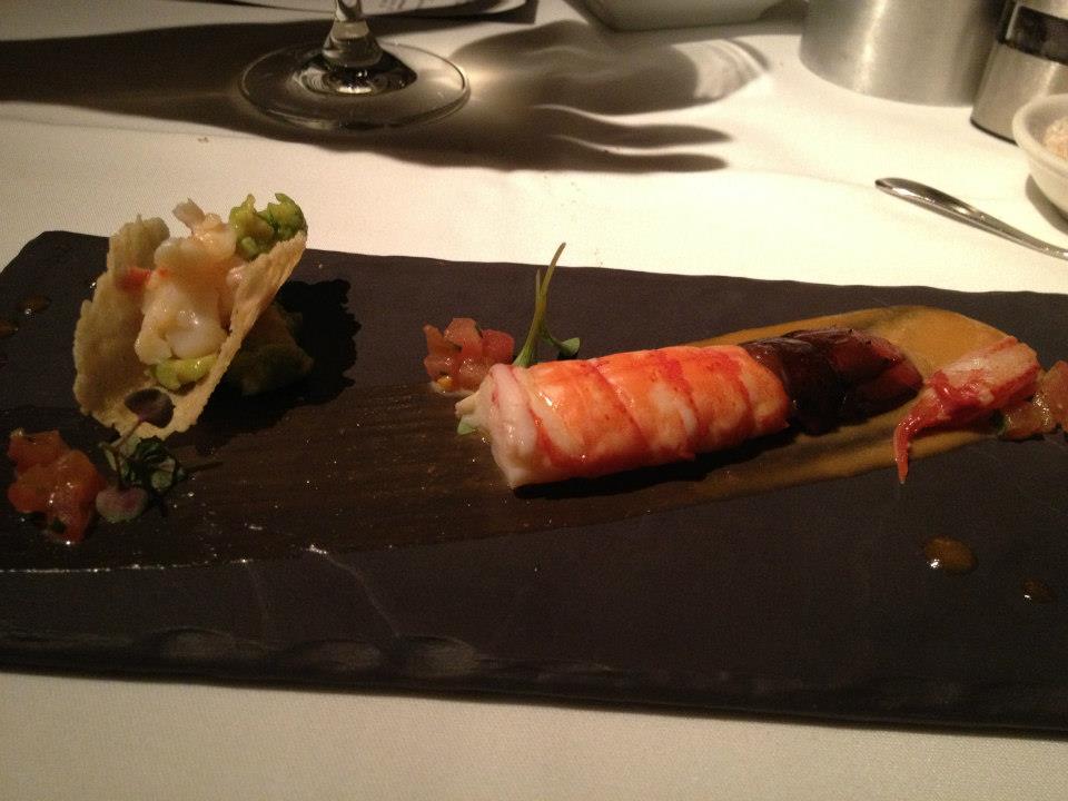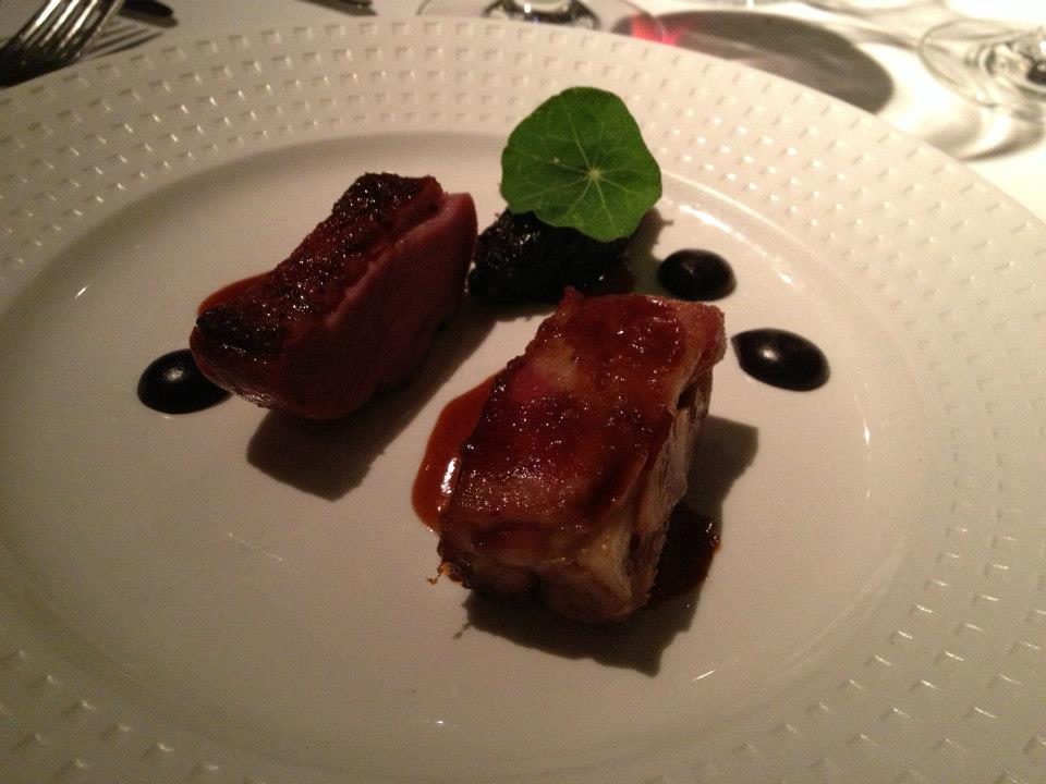 We stuck with seafood for course two – Blue Ridge marron, miso cream with Villa Wolf Pinot Gris 2011, Pfalz, Germany. Special care had been taken to present the marron tail and its sweetness was well matched with the salty smudge of miso cream that was on the plate. I also really enjoyed the little taco they had included. It was particularly posh and had such a refreshing flavour.