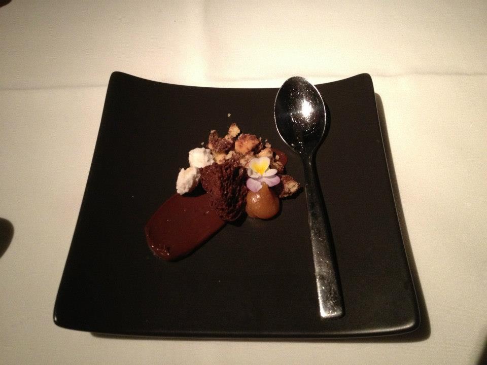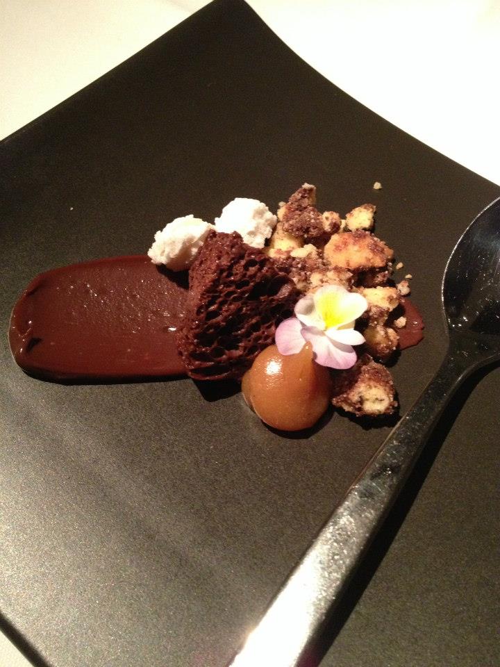 Preparing us for dessert next was the second intruder course – a pretty pre dessert – Chocolate Aero, peanut butter ice cream, complete with a few flowers. As a long time lover of all things sweet I was particularly enamoured with this dish, so lovingly plated and designed. The bubbly chocolate and the peanut nuttiness were a well matched pair, and the thick brushed chocolate on the plate contrasted nicely with the biscuity pieces that had been crumbled on. It definitely had me looking forward to the dessert course ahead.