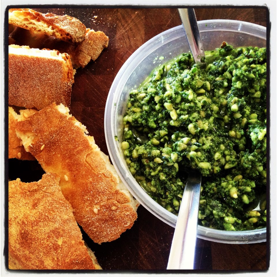Some beautiful bread (Toasted Turkish bread, fresh baguette, even a loaf of Tip Top would work) and a tub of their basil pesto and I’m a happy camper.