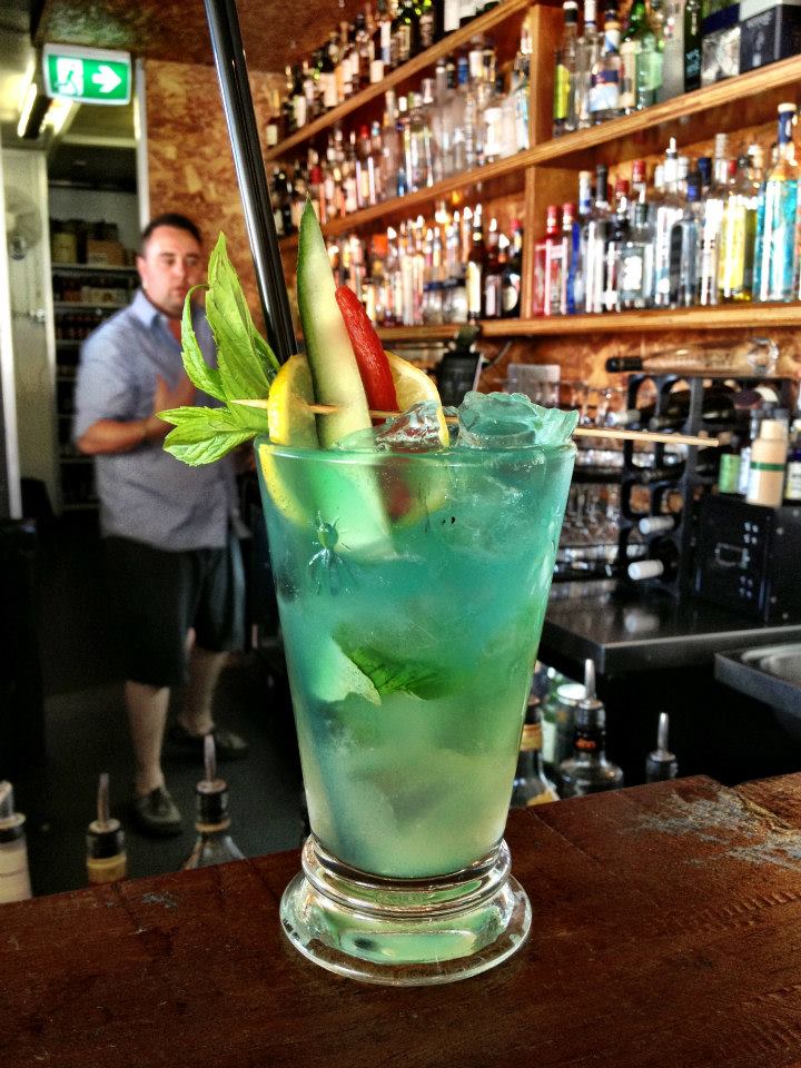 There’s a theatre involved with watching a cocktail being created. The preparation of quite an elaborate garnish, the balanced measures of different ingredients, which in this case included mint, lemon juice, Grand Marnier, a dramatic splash of blue curacao and a special Tahitian spice syrup.