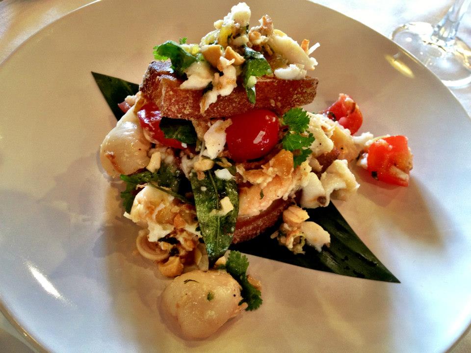 I think as soon as I saw the Salt and Pepper Pork, Swimmer Crab Salad, Cashew, Pineapple Nam Jim ($22) I knew that it is what I wanted. Apparently it had also taken GG’s fancy and while I insisted it really wouldn’t be the end of the world if we ordered the same dish, he decided instead to go with the prawn option – Barbequed Tiger Prawns, Pico de Gallo, Guacamole, Parsley Coleslaw.