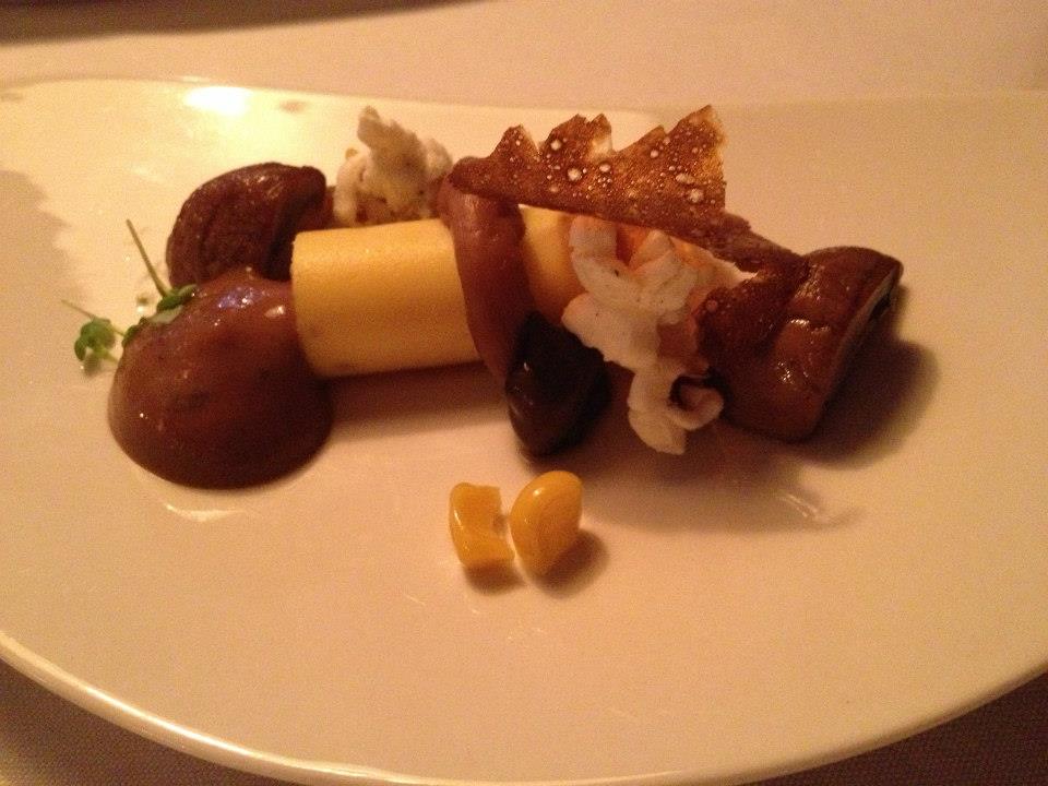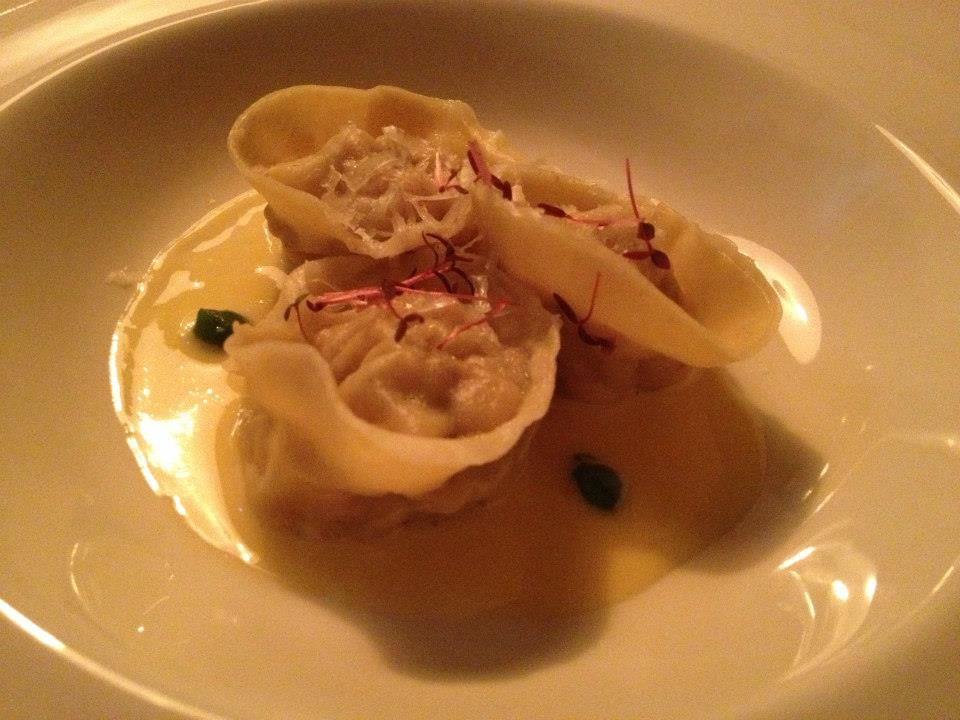 Up next came a course described only as Al dente. This was a pasta course that changed on a nightly basis. On this particular evening we were brought three pasta parcels containing orange and sweetbreads, in a champagne sauce and topped with grated parmesan. Hmmm… sweetbreads.