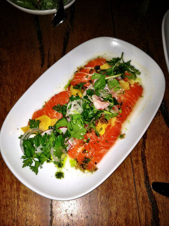 The first two dishes were a good size and had helped to put a bit of a dent in what had been a growling tummy when I first arrived. Our next two dishes were the Ocean Trout Ceviche, Preserved Ginger, Mustard Seeds, Basil ($17.50) and the Pan Fried Gnocchi, Stewed Peppers, Goats Curd, Aged Balsamic ($25.50) and also the salad of Mixed Leaves, Apple Sherry Dressing ($9).