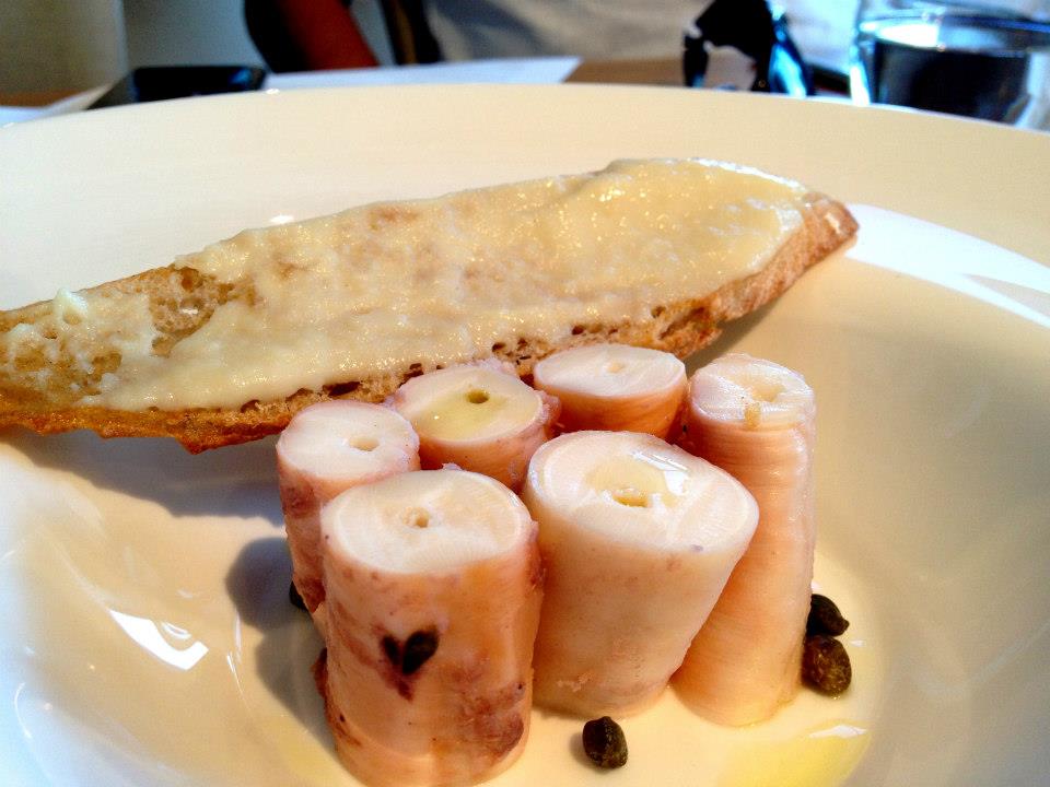 Something for the vegetarians now (which admittedly none at our table were). Green tomatoes, goats curd, herb salad, fennel flatbread. I don’t think I’ve ever eaten a green tomato, not that I can recall at least. The crisp bread was sprinkled with fennel seeds and made in house I believe. A little of the cracker along with the indulgently creamy goats cheese and topped with some of the tomato was pleasant. Very hard to compare it to the first three dishes though. I almost felt like I missed the meat element. I could see it as being an excellent side though and I doubt a vegetarian would share the shame chagrin as I at the lack of animal on their plate. I felt I would prefer this dish as a side as opposed to a starter.