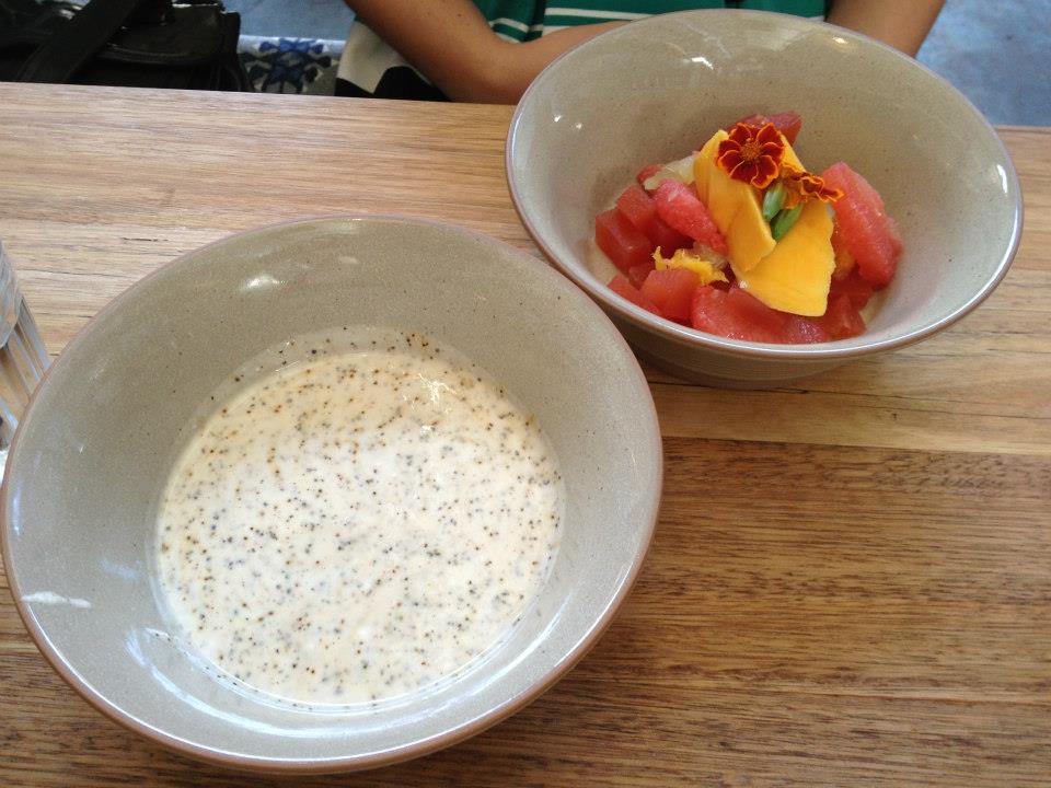 Coffee was definitely the first order of business and I ordered a soy latte and my friend, Miss E, a cappuccino. While they were being made we turned our attention to the menu. Some interesting options available. You can go for your standard eggs on toast and then tailor it to your liking with the range of different sides they have on offer. I decided to give the Bruschetta, avocado, heirloom tomato, labneh, poached egg ($19) a go. I think in my mind (with the exception of the avocado) it reminded me of my favourite breakfast dish at Jacs. Across the table Miss E ordered the Mango, watermelon jelly, citrus salad, wattle seed yoghurt ($14). Not entirely sure that she would be a massive fan of wattle seed yoghurt, she asked for her yoghurt to be served on the side, which was no issue.