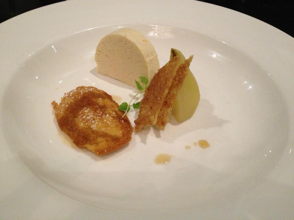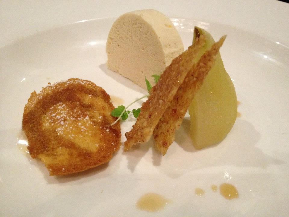 For dessert we could choose between either cheese or something sweet and we both ended up ordering the Cinnamon poached pear, pecan brittle, maple syrup cake, zabaglione parfait. It was a very well presented plate that arrived – a generous slice of the zabaglione parfait, along with a piece of the cinnamon poached pear, which supported some carefully balanced shards of pecan brittle. And it tasted as good as it looked! I particularly enjoyed the indulgent creamy parfait. Yum!