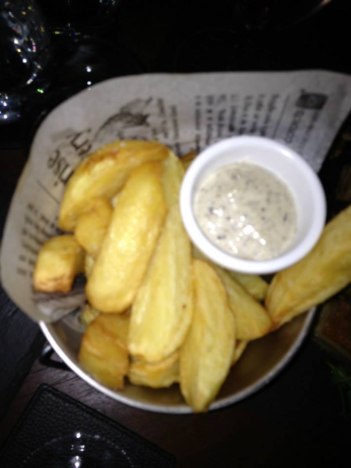 With drinks sorted our attention turned to food. Despite some very appetising choices in the small shared section we recognised that our table would make it tricky to stack up a whole lot of little plates and then each have a plate on top of that. So a main meal each was a much easier way to go. Naturally, my meat lover couldn’t go past the steak, Char grilled Rib Eye, spinach, crisp potatoes & bone marrow sauce (gf) 39, while Miss E went with the Roast Ora King Salmon fillet w/ peas, asparagus, leeks & parsley butter (gf) 36 and myself and Mr R liked the sound of the Slow roast pork belly w/ fennel, apple, walnuts & bacon jus (gf) 32. And I was intrigued by the Fattie chips w/ truffle aioli (v, gf) 9 so we ordered a serve of those to share.