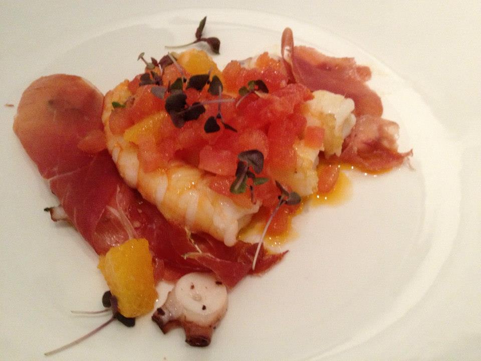Finally though we had made our selection. I was going to start with the Roasted Pigeon Breast, Juniper, Pickled Beetroot, Radicchio and for mains went with the Albany Free Range Pork, Seared Fillet, Braised Belly, Boudin Noir, Celeriac. Around the table, Boss B and Mr G were both going to start with the Smoked Ocean Trout, Pumpernickel, Lemon Yoghurt, Oyster and Mrs M with the Seared King Prawns, Fremantle Octopus, Jamon Serrano, Orange.