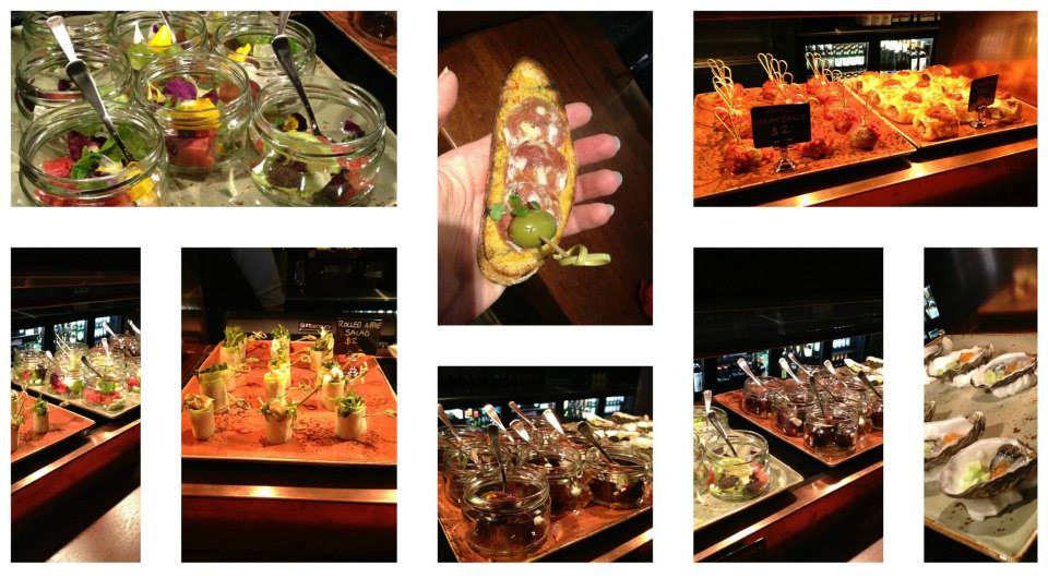 Definitely hard to pick a favourite from all the tasty items I was lucky enough to sample but I’d say it was a tie between the homemade sausage rolls, which was just perfection with flaky pastry, flavoursome meat filling and accompanying spicy tomato relish and the mushroom croquettes which packed a massive mushroomy punch within its crumbed exterior. I suspect I could have polished off the whole tray of both of those items. But I saved some room and turned my attention to my first official stick item, a dainty apple salad, which was an artistic strip of apple rolled around some soft cheese with a sprinkling of walnuts to up the crunch factor. There were two other salads, slightly larger in size that looked entirely precious in their glass jars. There was either a beetroot and fetta salad that looked fab with the bright splash of beetroot pink or there was a Mediterranean salad which had marinated tomato and some greenery along with some very colourful petals which really enhanced its prettiness. I’m all for edible flowers, I think they look great. Then there were wagyu sliders (one of the $6 items), which received rave reviews, oysters, some chorizo croquettes, slices of baguettes topped with some thin slices of an amazing cold meat (was like a salami but not entirely sure of the specific type) and a green olive might not have sounded particularly enticing but wowsers did they score goals in the flavour stakes! Yum! With their impressive open plan kitchen at the end of the bar of the first floor you could keep an eye on the action. Large paella pans were bubbling away and the smells were amazing! I’m told that during lunch on Monday to Friday there is a changing paella special, which is $10 a serve. Sounds like a great option for those lucky enough to work nearby.