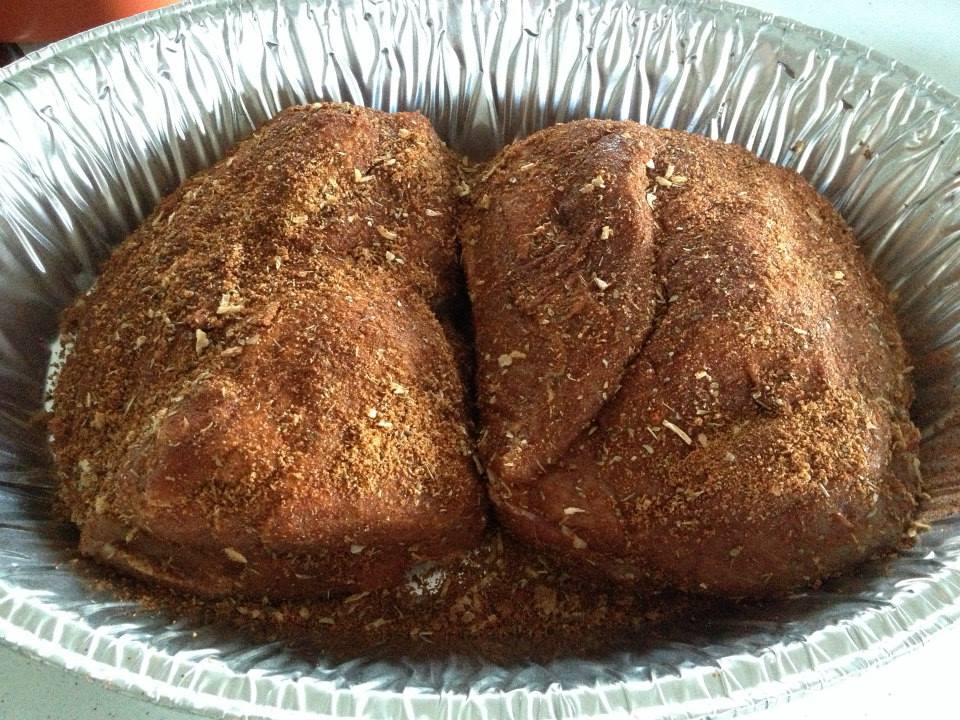If you want the pulled pork ready for dinner at 6pm, so work backwards. You need the meat to be cooking for 8 hours, then sitting in the oven for another 2 hours. So at 7.45am on Saturday take the meat out of the fridge, take it out of the bags and pat it dry. Take the rub you’ve made and coat the meat. I tend to be fairly generous with the rub, make sure it’s good and on there. I’d tend to use almost all of the rub I’ve made (it does have a bit of kick).