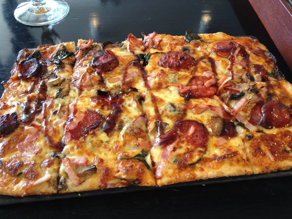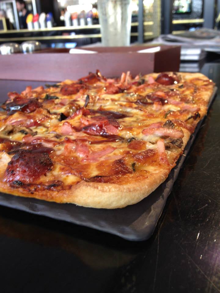 Time for food, food, food! We perused the menu and given I knew that the Royal made a mean pizza as soon as I saw the pizza special I was sold! Chorizo, bacon, Spanish onion, spinach, mushroom, chilli and bbq sauce (1/2 slab $24) sounded just too good to pass up! So I locked in a half slab, while GG went for Robbins Island Wagyu Burger, continental bacon and tomato relish, capel cheddar, lettuce, aioli, sesame bun and fried ($25).