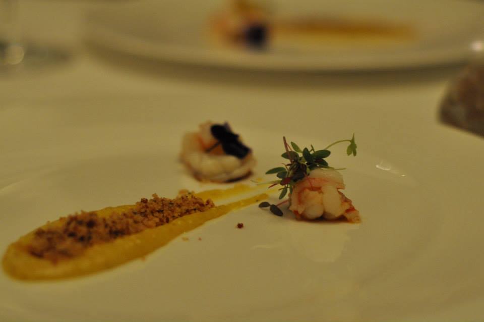 We had both mused that it was different for a degustation to start with a red meat, given that seafood tended to reign supreme as course one, but good to mix things up and the venison was lovely and light. Plus something fishy wasn’t far away as course two was Creamy corn puree, Jamon Serrano crumbs, yabbies (2012 Marq Fiano – Margaret River, Australia). Such an elegant looking dish, with its dramatic yellow smear, dusting of hammy crumbs and yabbies topped with flowers. Edible flowers really up the pretty factor of a dish and it certainly had here. I really loved this dish. The sweetness from both the yabby and the corn puree married up perfectly with the slight saltiness from the Jamon Serrano crumbs. Magic crumbs that looked just like bread crumbs but packed so much more punch. An interesting and delicious combination of flavours.