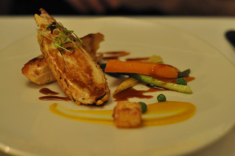 Up next was the first of the ‘mains’. I love a menu that has two mains! So first up it was time for some bird, Corn fed chicken breast with pancetta, polenta, carrot and ginger sauce (2011 Moric Balufrankisch – Burgenland, Austria). They had literally layered thin slices of pancetta under the skin of the chicken breast before it had been cooked. It was an inspired decision and added an extra element of magic to what may have merely appeared to be a simple chook and veg dish. Nothing simple about it! Plenty of crunch to the vegies too. Another pleasing course and quite liked the slight spice from the ginger sauce. I do enjoy ginger as a flavour.
