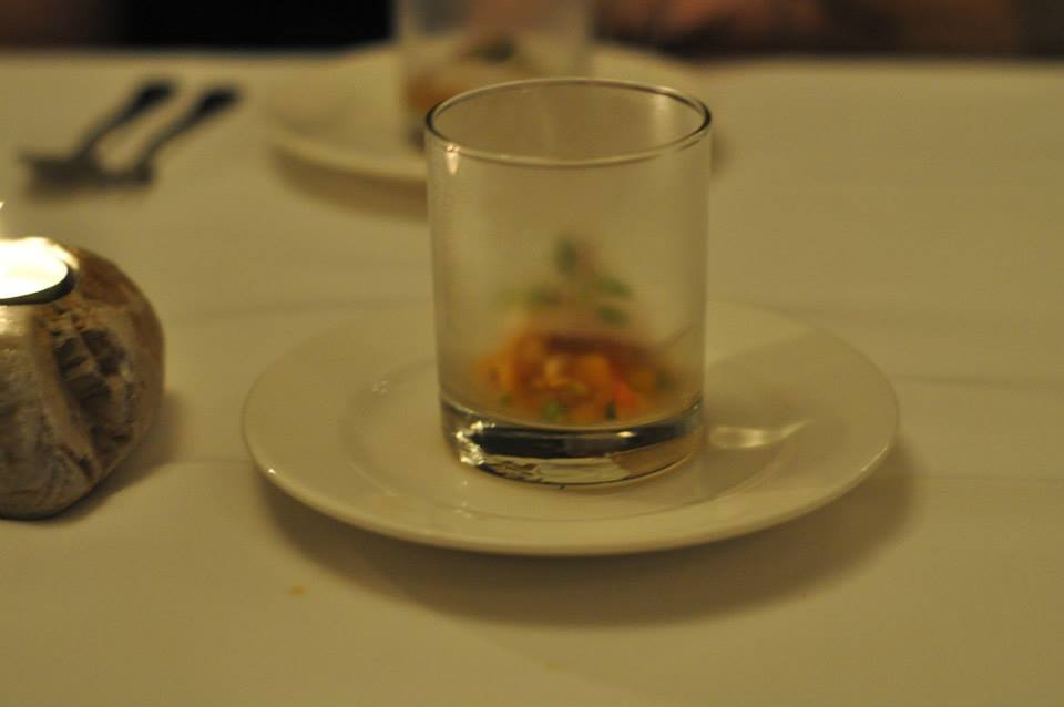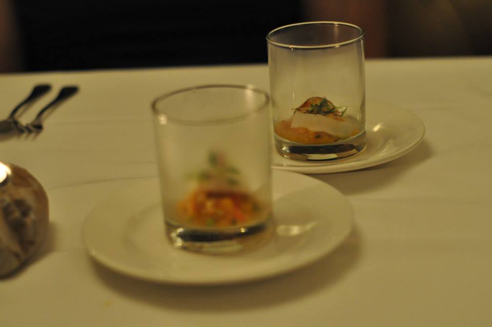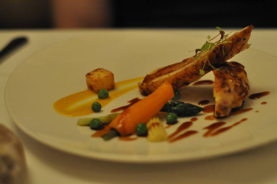 Well bon soir Entremet. As I would learn an entremet translates to “between courses” but what an exciting in-betweener it was! A small glass was presented, topped with a plate and mysteriously filled with smoke. It contained a perfectly plump scallop and fresh, diced peach. It always amazes me how such small morsels can be so incredibly flavoursome.
