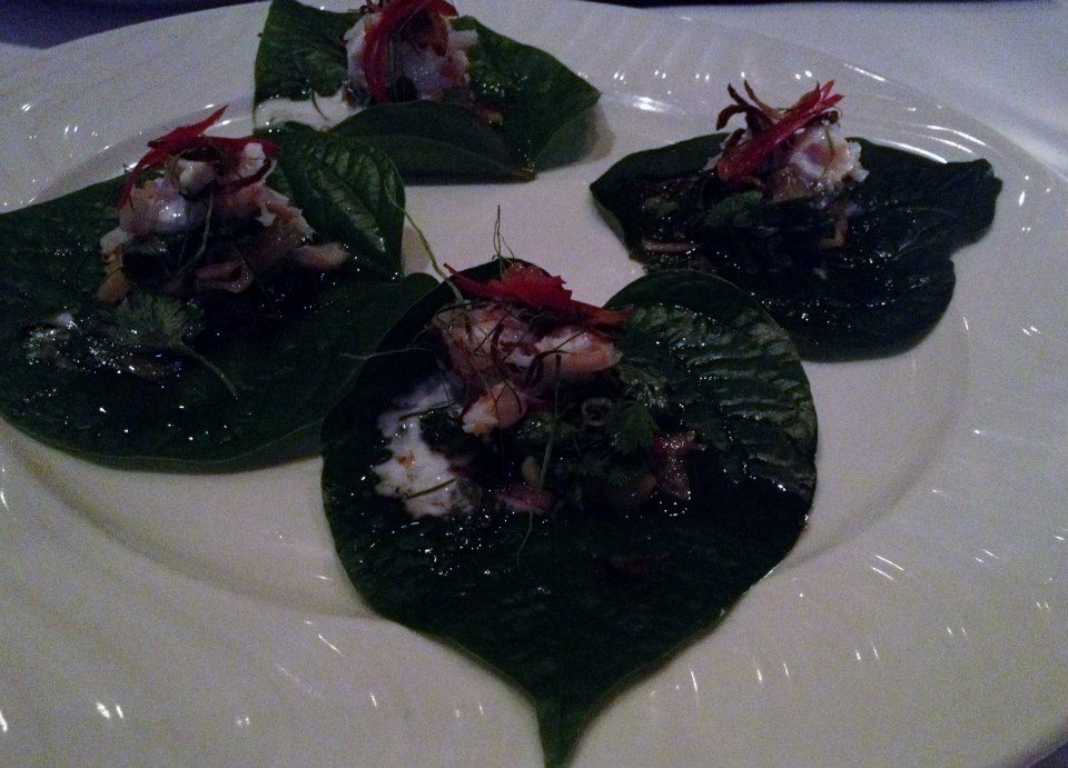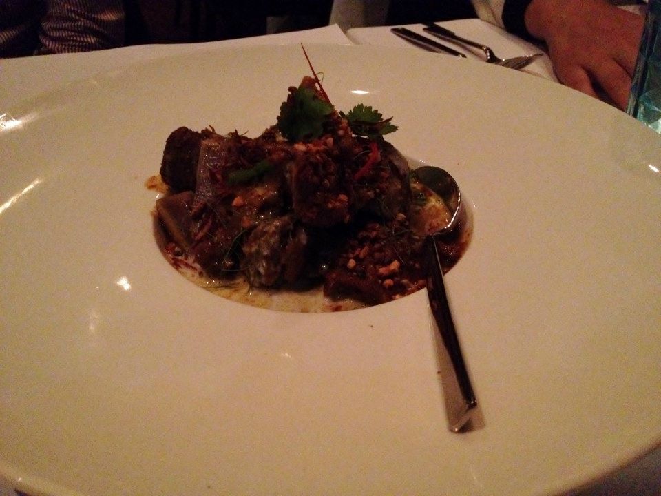 2. Miang of prawns- mango, herbs, coconut milk and lime served on betel leaf: I’ve only ever had food on a betel leaf once before. Years ago at Longrain in Sydney and I remember loving it. Couldn’t tell you exactly what it was, but it is a fond hazy memory in my mind. The Nahm Thai betel leave entrée was just amazing. The coconut milk added a slightly tropical and decadent richness to what was again, just a mouthful, but they just add so much wow to every bite. Carefully considered herbs and spices and perfectly sweet prawns and just so well balanced. Bravo and here’s to more food served on leaves 🙂