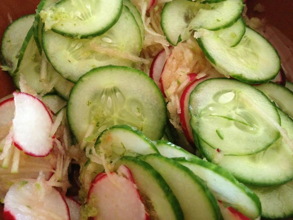 Radish and Cucumber Slaw – wasn’t overly happy with the presentation of this. Had visions of julienned green apple sticks but the apple I chose was a bit too soft.
