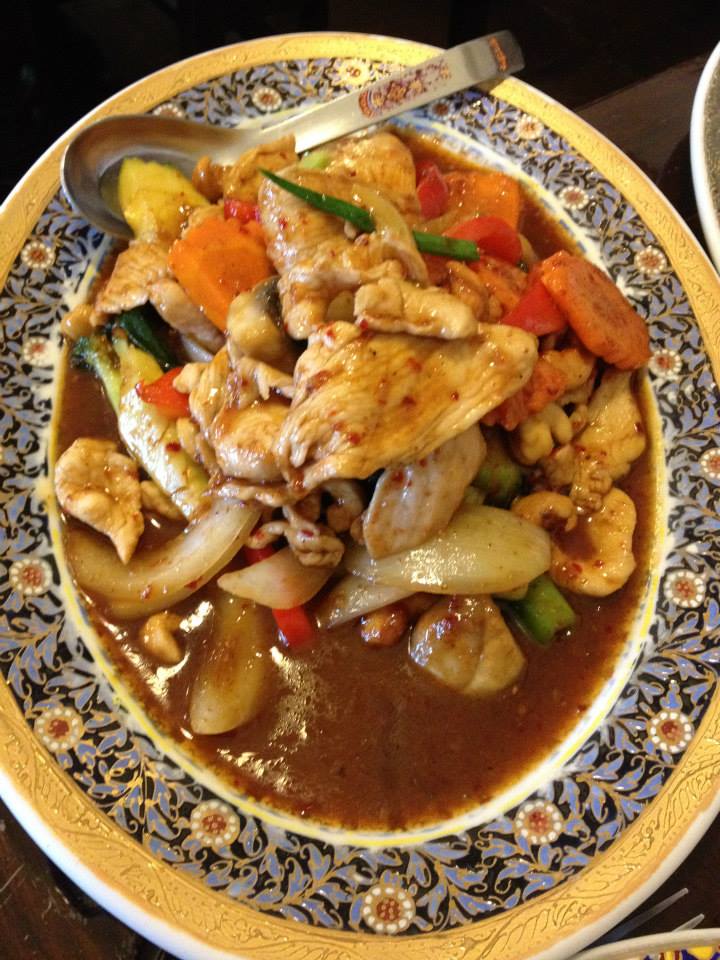 Thai Fried Rice – Thai Style fried rice cooked with chicken, egg, onions and vegetables Pad Chicken with Cashew Nuts – Sliced chicken stir fried with sweet chilli paste, cashew nuts, vegetables and Thai Sauce.The spring rolls arrived in a flash and were red hot with perfectly crispy pastry and a small dish of sweet chilli sauce. I looked longingly at them. It’s always a battle between knowing you desperately want to eat them because they look and smell divine, but knowing you should probably just give them a few moments so you don’t burn your mouth to bits. I waited for what felt like an eternity, but in reality was more like a minute, and took an eager first bite. Very tasty! We liberally dunked them in the sweet and spicy sauce and in a flash they had disappeared.
