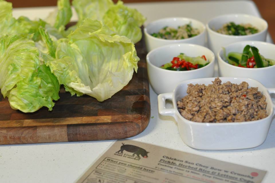 We were going to have the Chicken San Choy Bow with Crunchy Pickle, Herbed Rice and Lettuce Cups first so I donned an apron, poured a glass of wine (not a requirement, but just something I like to do when I cook 🙂 ) and diligently arranged all the ingredients out on the bench. With a knife and cutting board at the ready it was go time. On the equipment side, the things you’ll need are all at the more basic end of the scale – pots, pans, cutting board, knives – which is handy and doesn’t mean you’ll need to race out and order a thermomix 🙂
