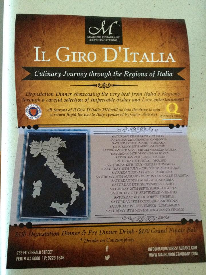 Throughout 2014 Maurizio’s Restaurant is holding an amazing line up for degustation dinners showcasing a different region of Italy. They will be held on Saturdays and kick off on March 8th with Puglia and run through to November.