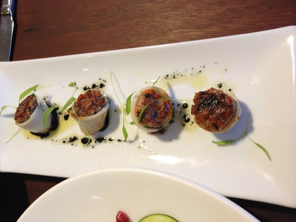 The eggplant was an artistic arrangement with it’s bright red pool of sugo (a tasty tomato sauce) along with four pieces of crumbed eggplant cylinders. They tasted delicious! I loved the crispy outer coating and whatever herbs and spices they used to give the aubergine such a rich flavour. That along with the sugo, made the dish really delicious. My favourite of the three, though it was a very tough decision.