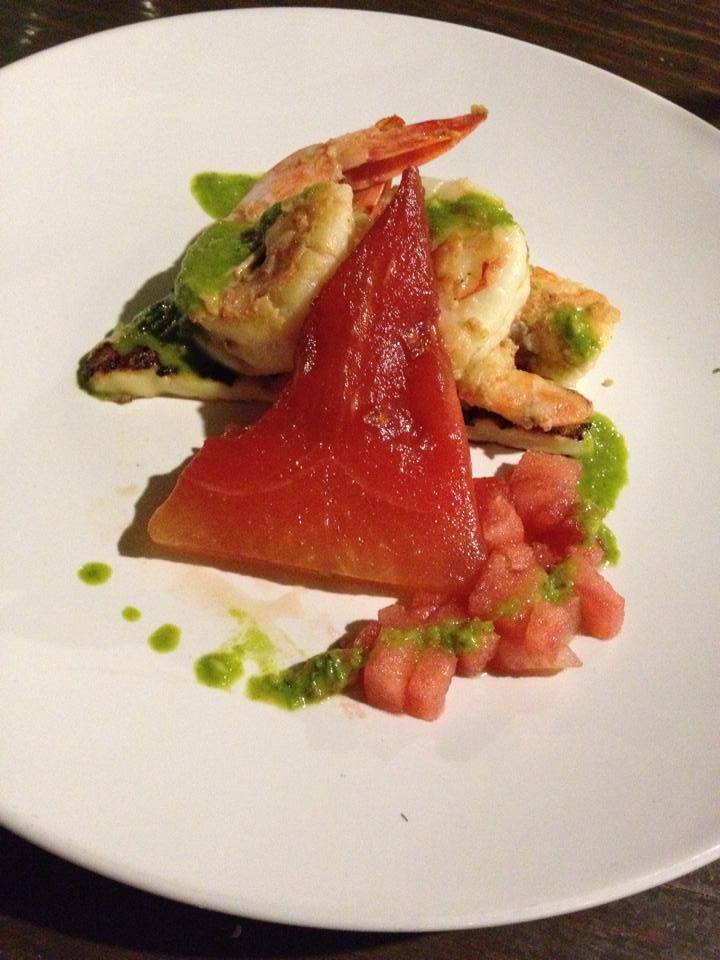 Grilled Lime Tiger Prawns, Watermelon, Haloumi, Basil