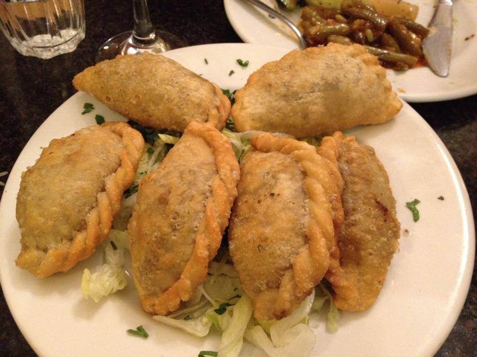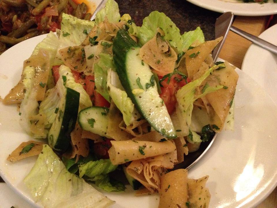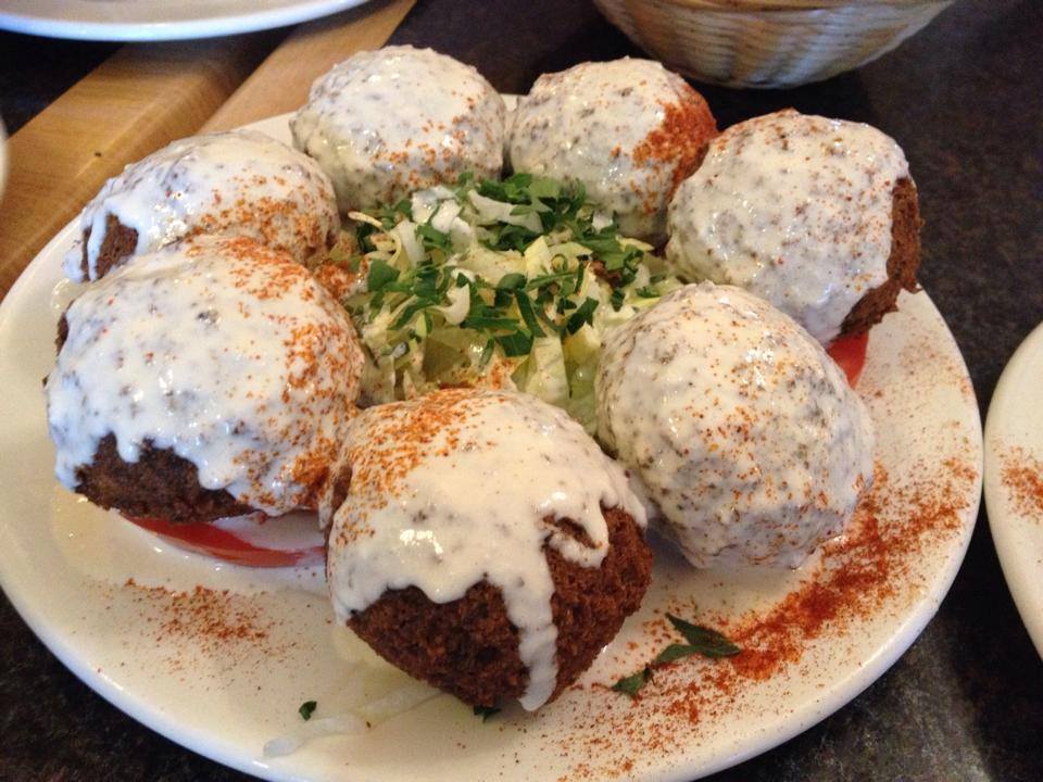 Fried Kibbeh – Balls of lamb and crushed wheat filled with minced lamb, pine nuts and onion Green salad with Fatoush bread