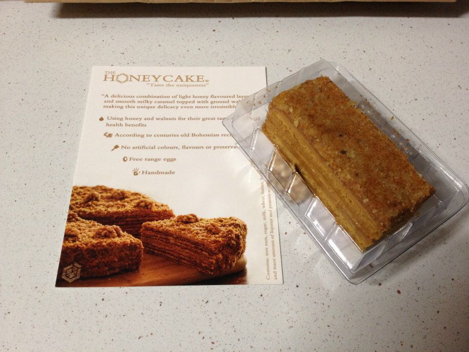 “The Honeycake is a delicious combination of light honey flavoured layers and smooth milky caramel filling topped with ground walnuts”