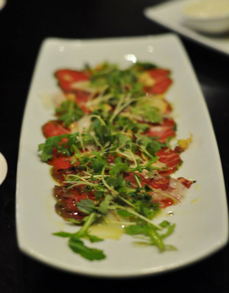 • Beef carpaccio – parmesan, garlic chips, rocket, truffle oil ($19)