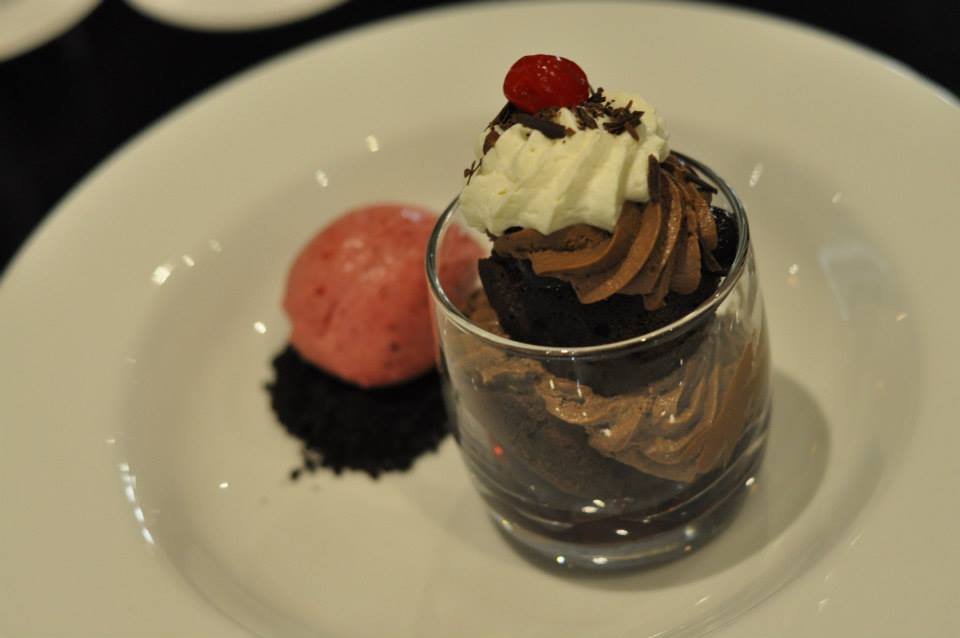 Black forest deconstructed chocolate sponge, dark chocolate mousse, berry compote, chocolate soil, fruits of forest gelato ($14)