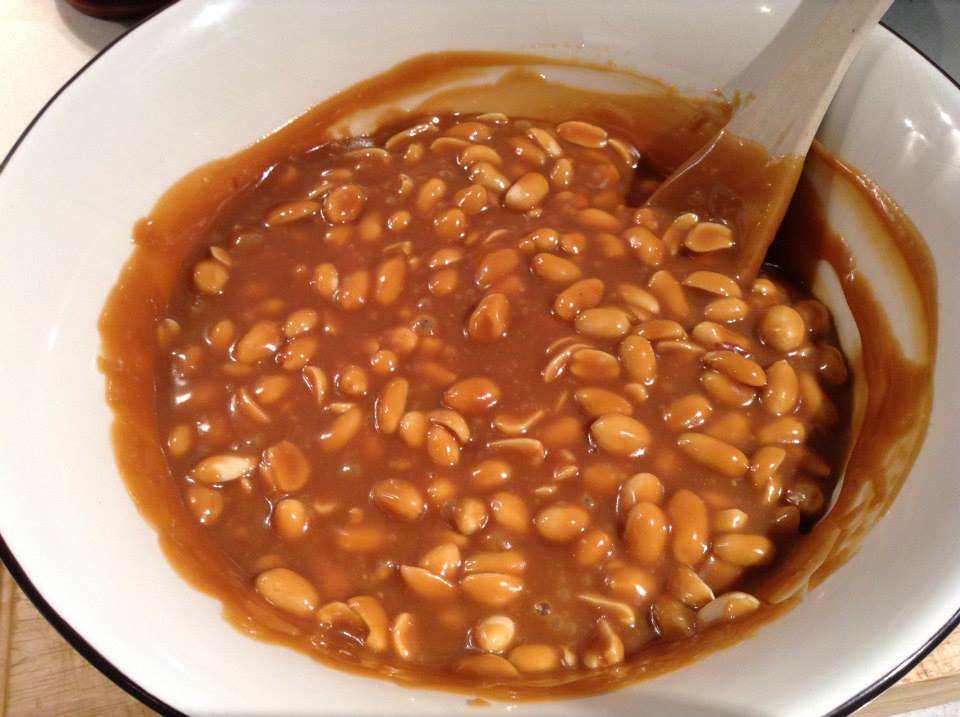 - Remove the pot from the heat and add in the peanuts. Thoroughly mix together and then add this layer on top of the marshmallow and spread evenly on top.