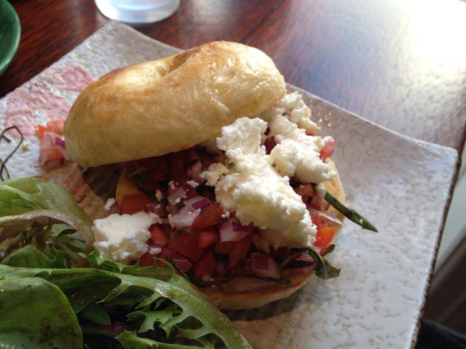 I thought the dish I had chosen presented well. Not a giant bagel but it was nicely topped with ample freshly diced tomatoes, torn basil leaves and a generous crumbling of creamy goats cheese. The piping hot fries were elegantly arranged in a separate container and wonderfully seasoned with a really interesting spice and it was refreshing to have the crunch of the green salad to finish with. I really enjoyed my breakfast and it was a nice size, so it adequately dented my appetite, though I wasn’t overly full. Could I have eaten two poached eggs on top? Maybe…. next time I suppose 🙂 And in terms of where it stacked up in the bruschetta battle, hard to say really, given it was such a different spin and didn’t have a eggs, but given my love of bagels I did really enjoy it.