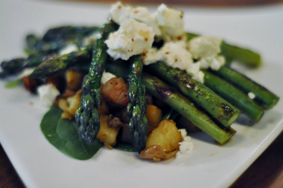 Asparagus & Pancetta: Grilled asparagus with chunky pancetta, fried potatoes, Persian feta, wilted spinach & sherry vinaigrette ($18) (GF)