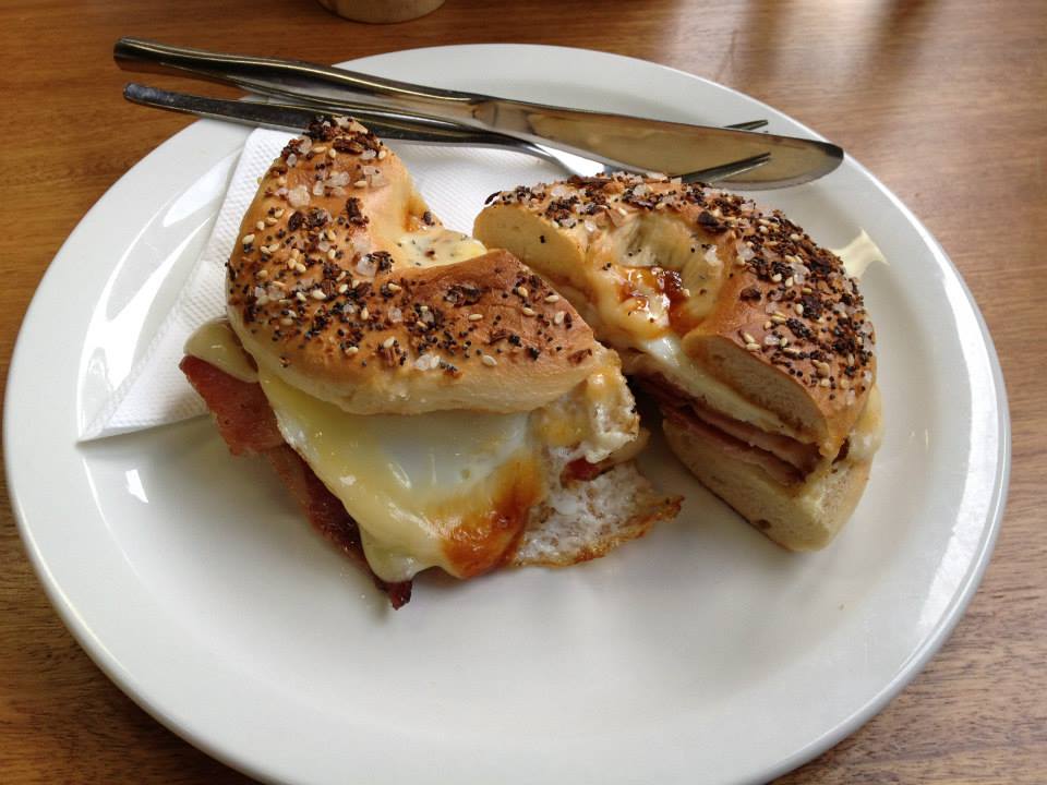 Calling in for a quick pre-work breakie with Mrs P we both ordered coffee and bagels, how New Yorker of us! In the display cabinet we could spy them ready to go with an elegant stack of bacon, egg, cheese, a little relish and a schmear of cream cheese. Dual cheeses! We were living lavish that morning!